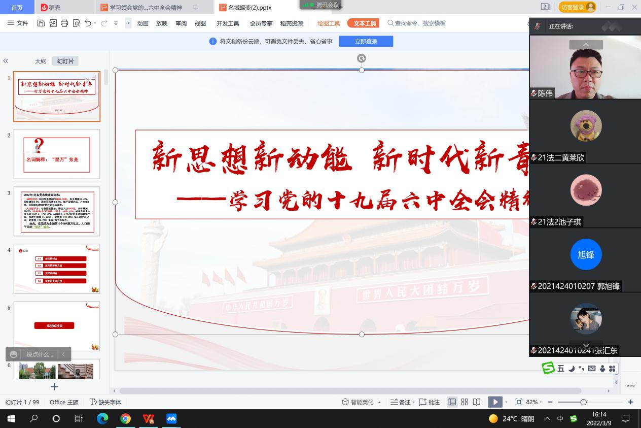 院长陈伟于线上为21级法社1班、2班,21级社工1班、2班学生上思政课。