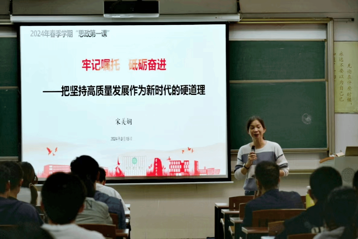 为深入学习贯彻习近平新时代中国特色社会主义思想,学习宣传习近平文化思想、习近平总书记视察广东重要讲话及重要指示精神。3月15日,肉视频 党委书记宋美娴在莞城校区六号楼405教室为2023级计技设计1班和2023级经济与金融1、2班共88名学生讲授了以《牢记嘱托 砥砺奋进——把坚持高质量发展作为新时代的硬道理》为题的“思政第一课”。