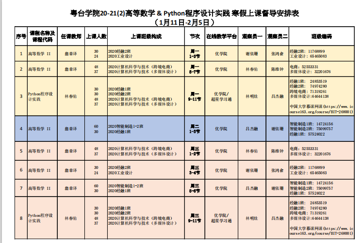 截止目前,244名2020级学生按照各班课表安排按时组织开展线上学习活动。为做好教学督导工作,我院制定了两门课程的寒假上课督导安排表,由各位系主任亲自上线督导并汇报各系上课情况。