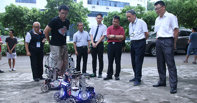 机器人实验室成员回到莞城机电楼向校领导李琳、马宏伟以及学院的机器人爱好者进行了展示,并且在学院的支持下在莞城校区的校内招待所进行机器人的最后阶段的调试、操作手练习。