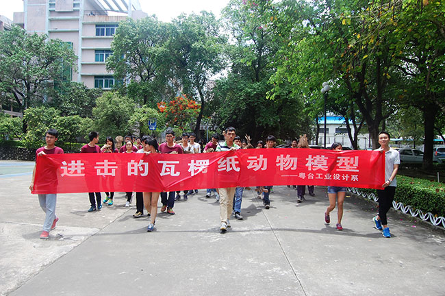 工业设计系以实作为教学精神,透过活泼创新模式的教学活动培养学生创新创业的能力,基本设计课程以瓦楞纸做为板材运用的基础练习,藉由平面崁合的结构创造出立体造型。每一个动物模型皆是由3维模型计算出各片大小再一刀刀裁切出来,富含趣味与原创。跳脱静态展览而尝试以动态活动展示作品,尝试为莞城校区注入年轻活力与设计元素。这样一群活力四射的工业设计系学生,带着各自倾力打造的瓦楞纸模型,用一场快闪活动,刮起一股小旋风,他们的青春活力感染了所有人,爱生活,爱设计,让优秀成为一种习惯。