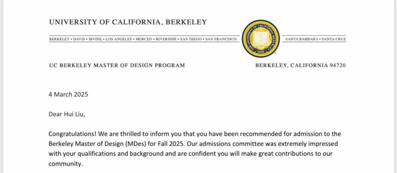 2021级工业设计系学生刘辉用四年青春解出最优解。近日,刘辉获得世界顶尖学府,QS世界大学排名第10——美国加州大学伯克利分校(UC Berkeley)设计学硕士录取通知书。这位始终以“沉淀与积累”为信念的青年学子,以三年专业第一、横扫多项国际大奖、国家奖学金得主、雅思7分的硬核履历,在毕业季交出了瞩目的答卷,以四年如一日的勤勉与创新精神,书写了一段从校园走向国际的奋斗篇章。