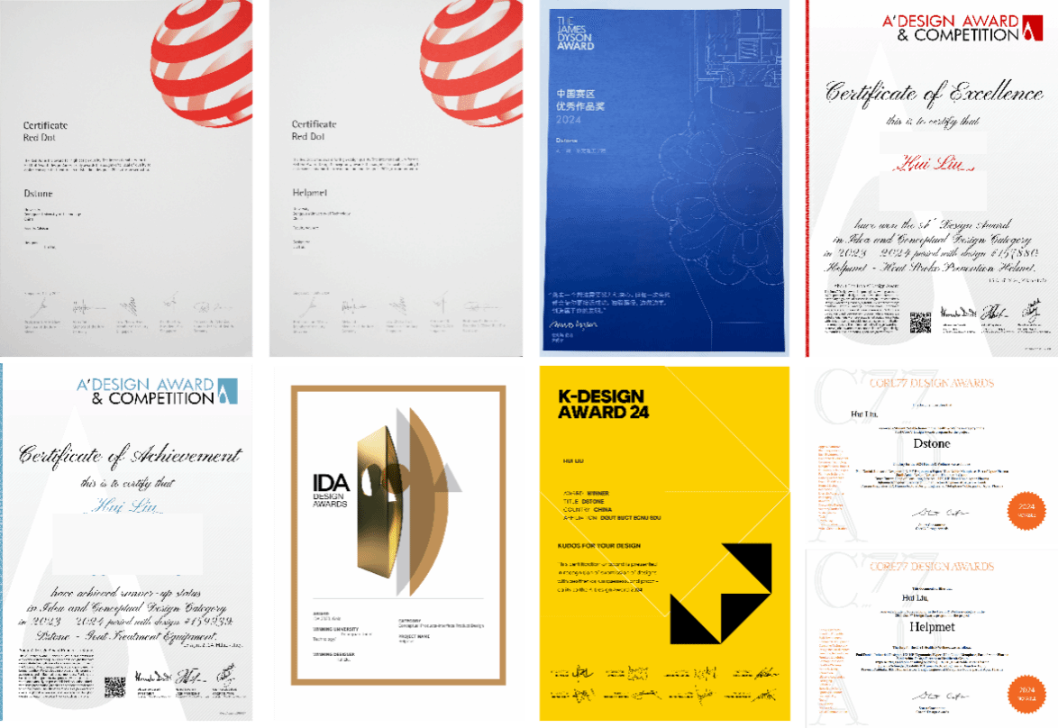 作为学院创新团队的骨干成员,刘辉在多个国际级设计项目中担任核心角色。在Dstone项目中,他主导交互设计、服务设计等关键环节,深度参与从概念构思到成果落地的全流程开发。项目以“用户需求为导向”的设计理念,斩获2024年红点设计奖(Concept Winner)、戴森设计大赛中国区8强、Core77设计奖健康与保健类学生荣誉奖等十余项国际大奖。与此同时,刘辉作为Helpmet项目的核心成员,以人文关怀与技术创新融合的设计方案,横扫红点设计奖、IDA设计奖金奖、A’Design奖铁奖、Spark设计奖铜奖等奖项。学院提供的竞赛辅导、跨领域合作资源,助力他将课堂理论转化为具有社会价值的创新方案。
